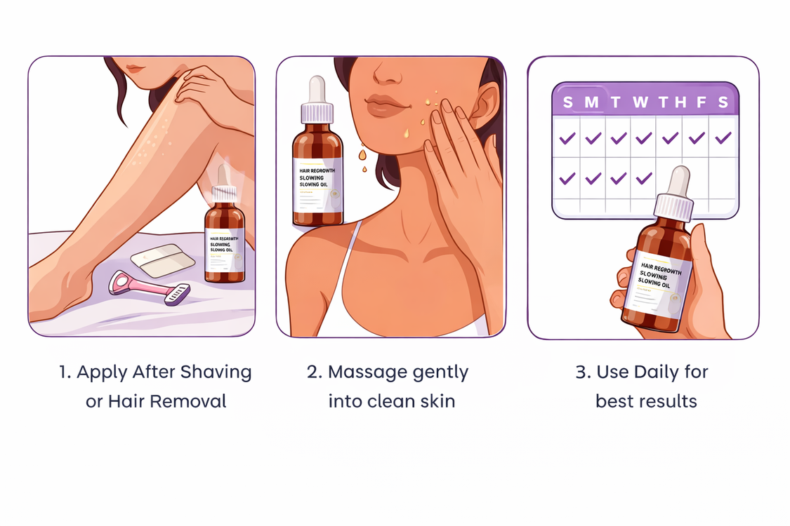 Use daily for best results. The lightweight oil absorbs quickly, helping calm the skin while supporting softer, slower-looking regrowth over time.